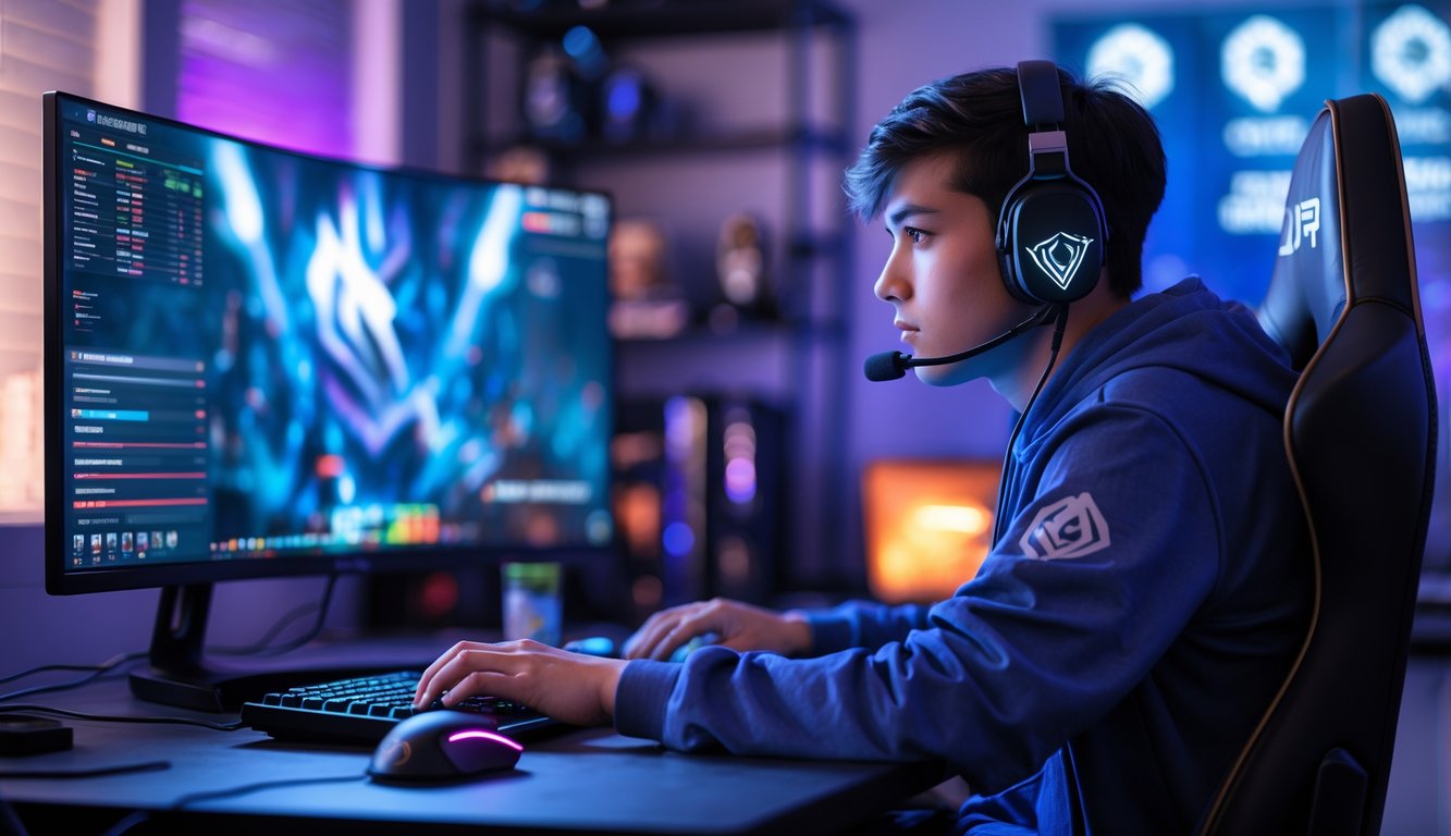 Seorang pemain muda fokus bermain Dota 2 di depan komputer dengan peralatan gaming lengkap di ruangan yang terang.