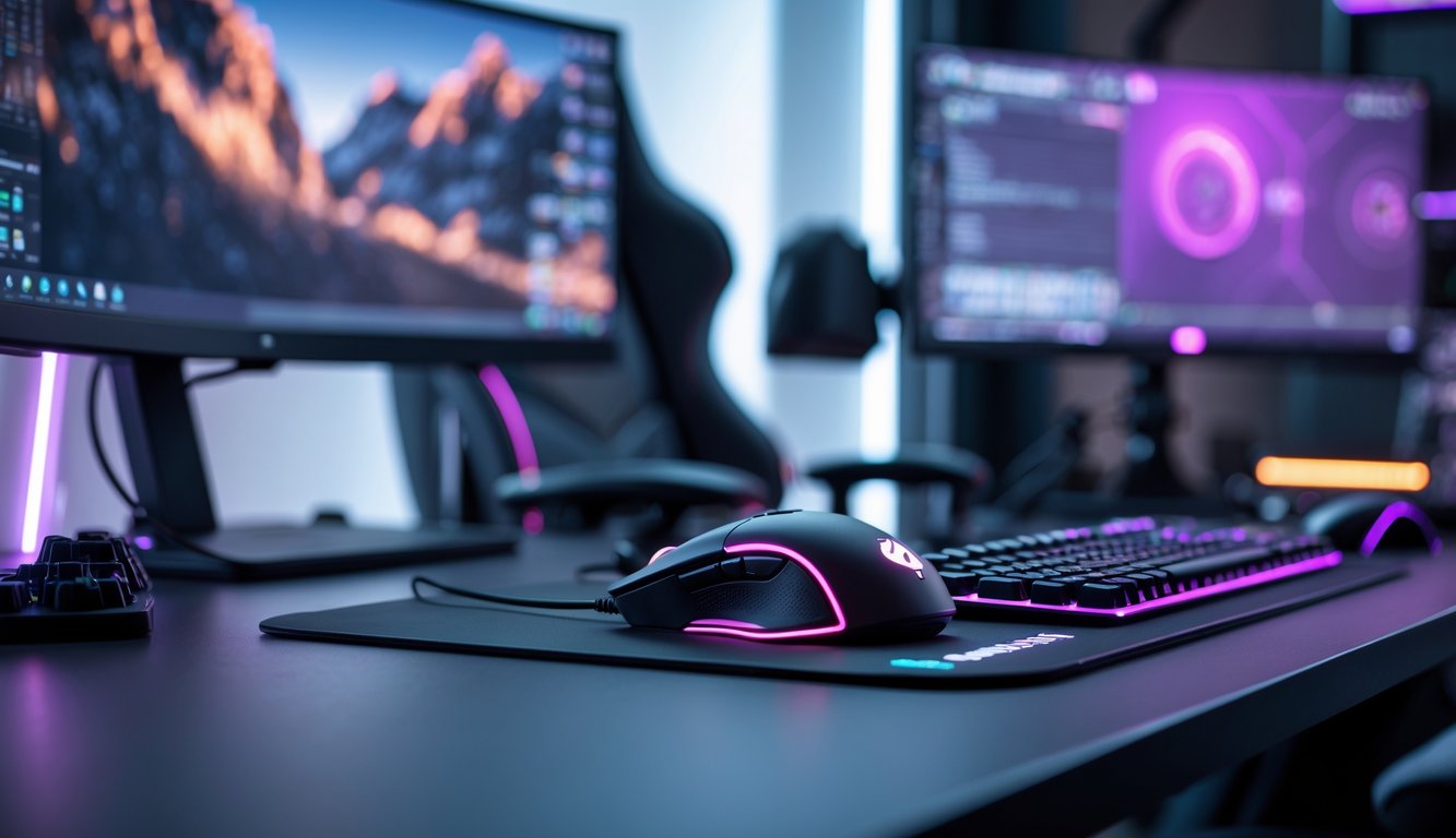 Sebuah meja gaming modern dengan mouse gaming dan monitor menampilkan permainan Valorant di latar belakang.